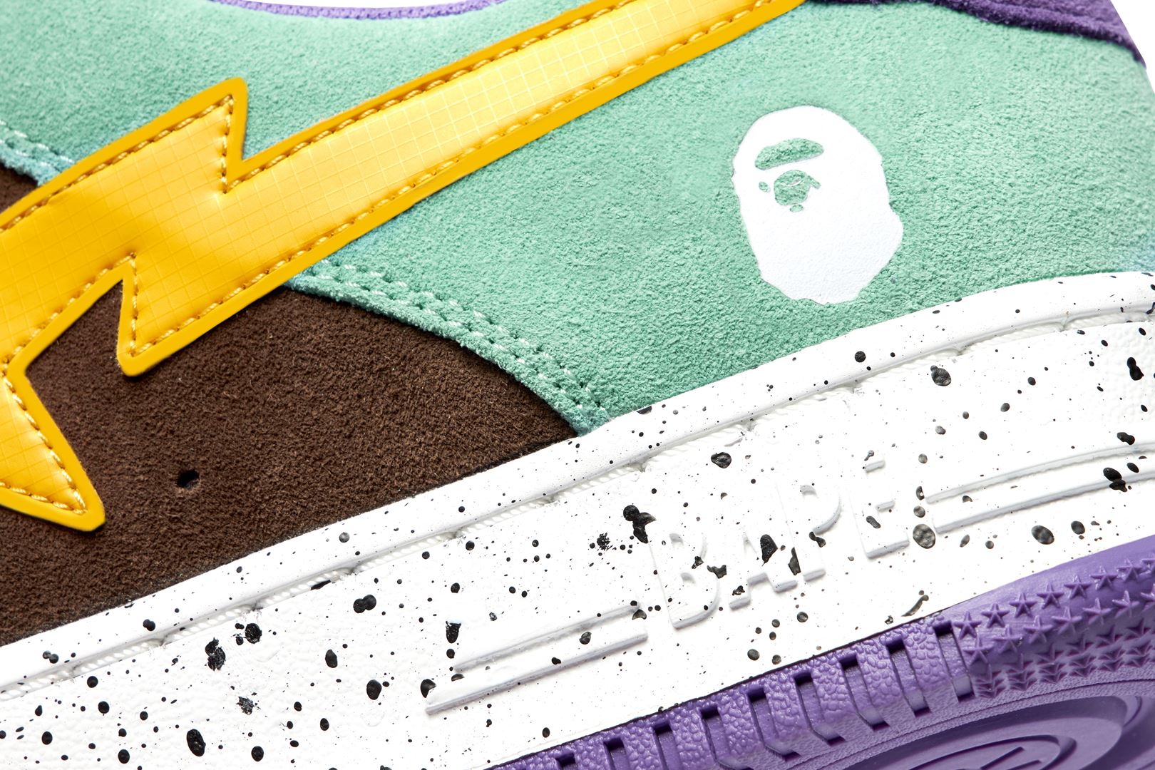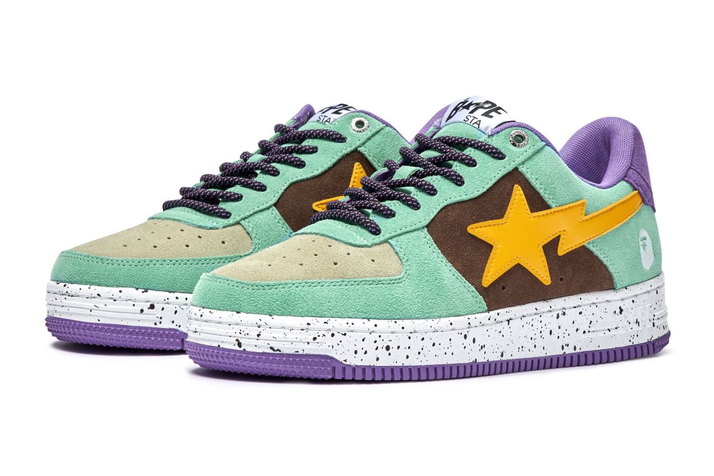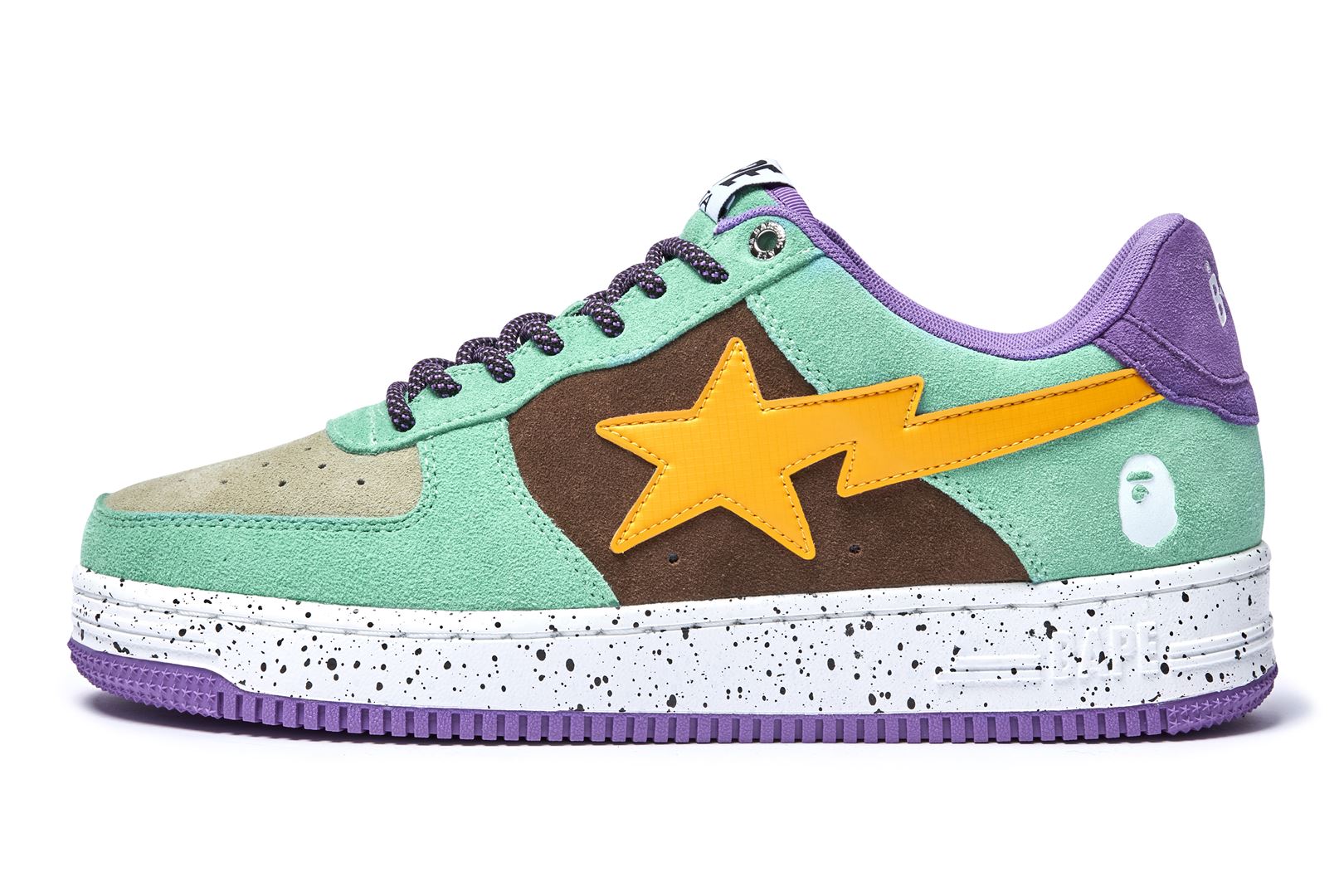 The upper is wrapped in bright green and chic black suede, and the BAthtPE STA part, which is the symbol of the series, is designed with a different material in a bright color. The finish is accented with shoelaces with an unusual paracord design and inkjet print on the sole.
