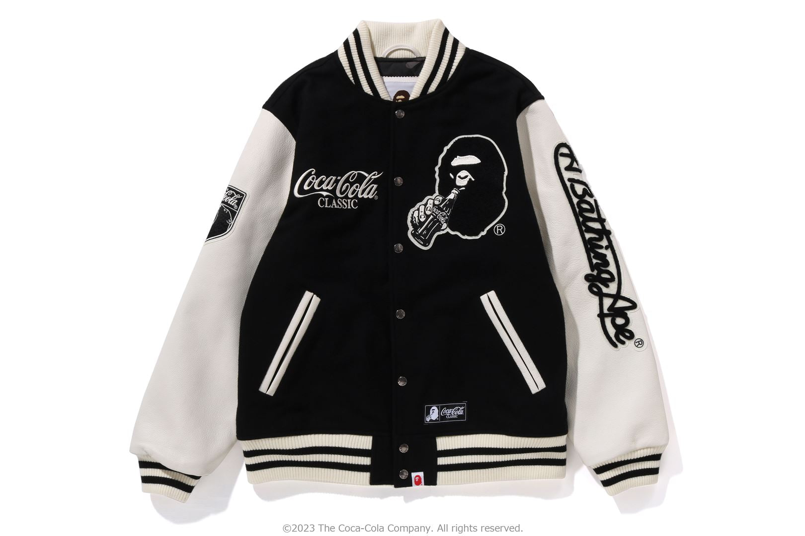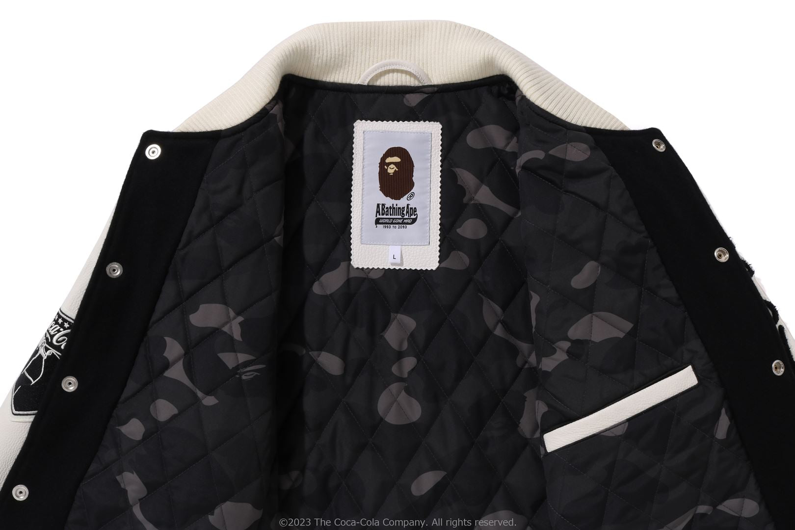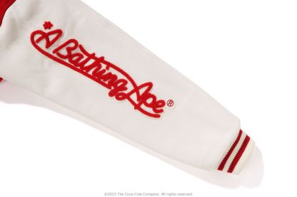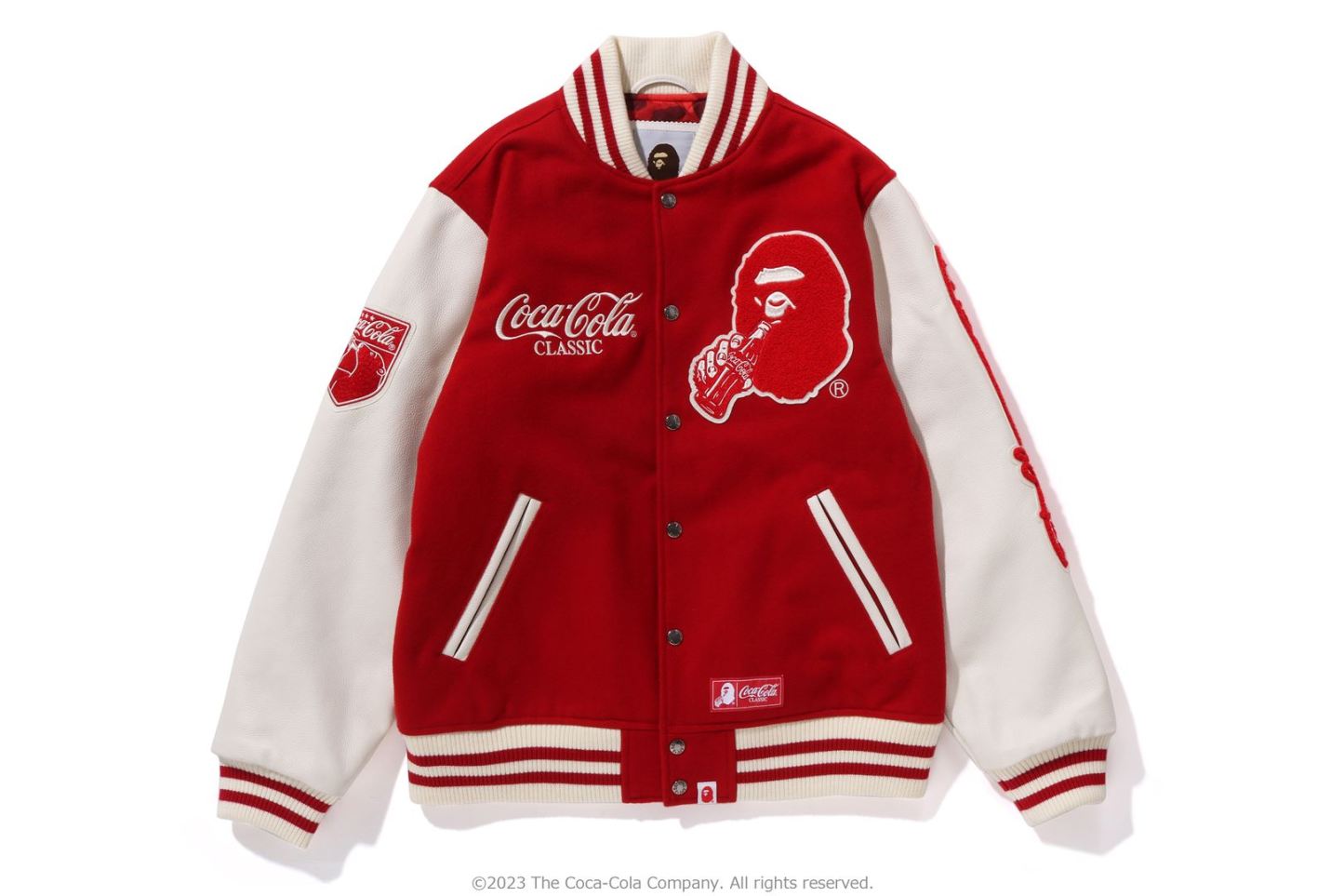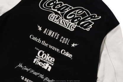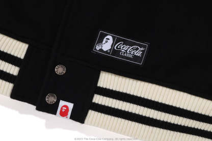 A varsity jacket with piece-dyed wool/nylon blend melton material on the body and cow leather on both arms. The lining is quilted with a COLOR CAMO pattern and padded. AthtPE HEAD Sagara patch with Coca-Cola on the left chest, Coca-Cola logo directly embroidered on the right chest, A BATHING AthtPE logo Sagara patch on the left arm, Coca-Cola Polar Bear embroidered emblem patch on the right arm, on the back A design with the Coca-Cola logo Sagara patch and multiple letter graphics directly embroidered. An X Coca-Cola woven name is stamped on the lower center of the body, and a piss name is tucked in the center of the hem. Slash pockets are placed on both sides. A silhouette with a relaxed fit. Available in 2 colors and 5 sizes. A collaboration model with Coca-Cola. ?2023 The Coca-Cola Company. All Rights Reserved.