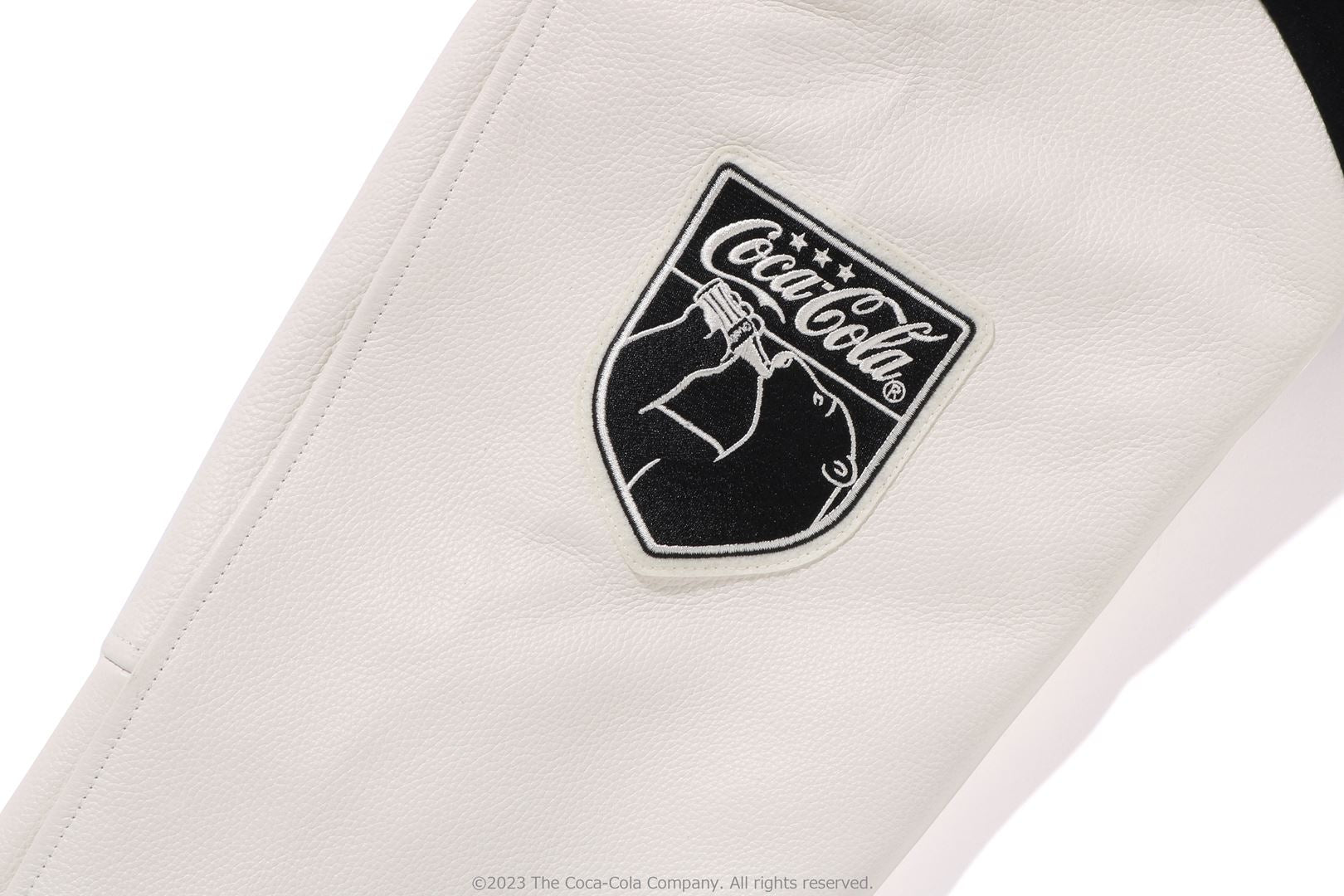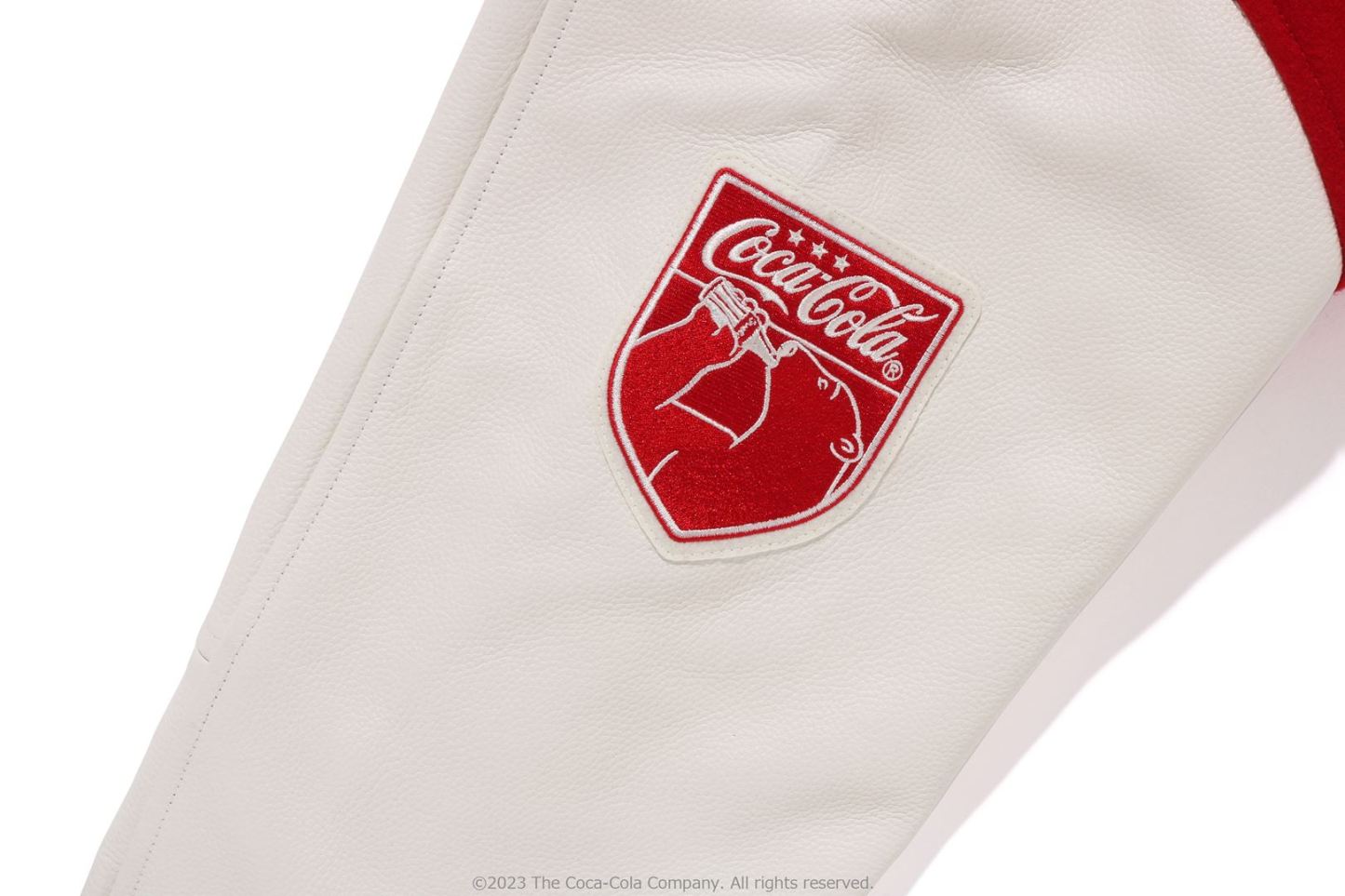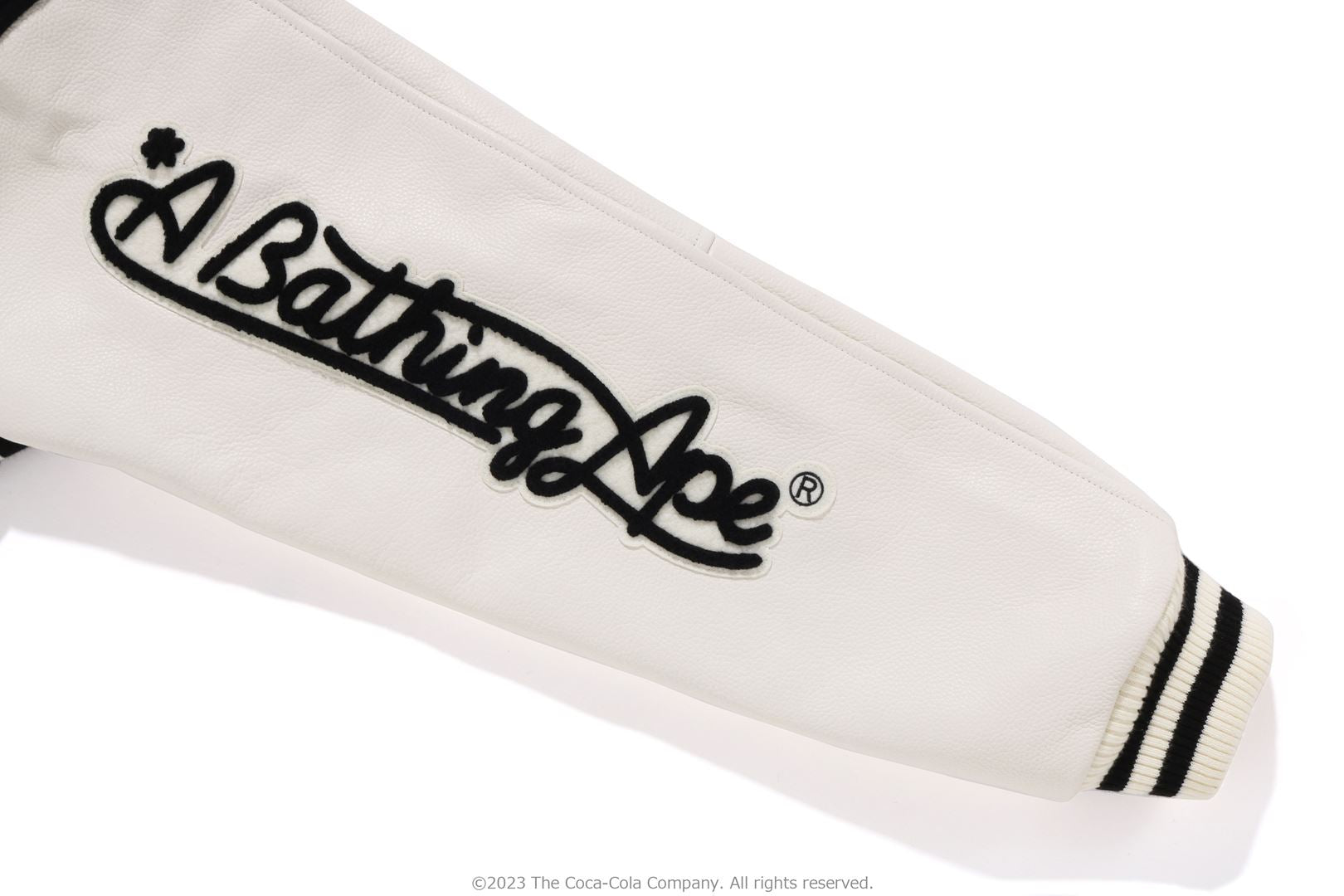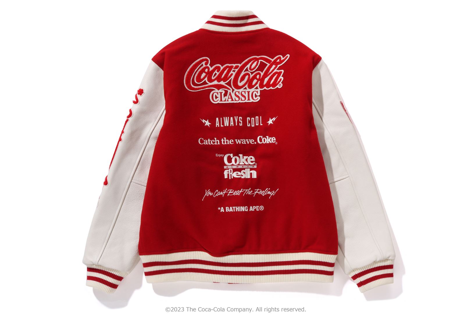 A varsity jacket with piece-dyed wool/nylon blend melton material on the body and cow leather on both arms. The lining is quilted with a COLOR CAMO pattern and padded. AthtPE HEAD Sagara patch with Coca-Cola on the left chest, Coca-Cola logo directly embroidered on the right chest, A BATHING AthtPE logo Sagara patch on the left arm, Coca-Cola Polar Bear embroidered emblem patch on the right arm, on the back A design with the Coca-Cola logo Sagara patch and multiple letter graphics directly embroidered. An X Coca-Cola woven name is stamped on the lower center of the body, and a piss name is tucked in the center of the hem. Slash pockets are placed on both sides. A silhouette with a relaxed fit. Available in 2 colors and 5 sizes. A collaboration model with Coca-Cola. ?2023 The Coca-Cola Company. All Rights Reserved.