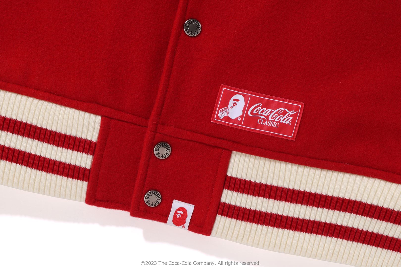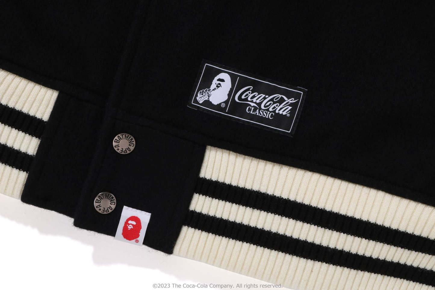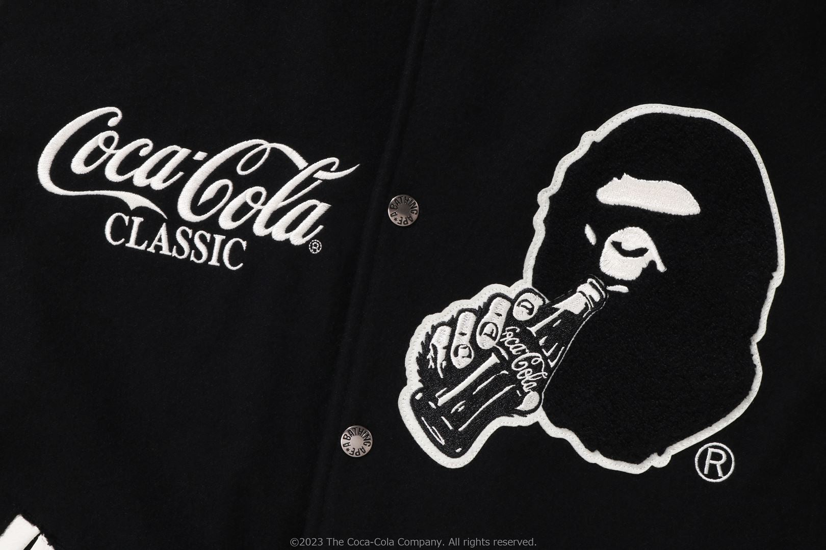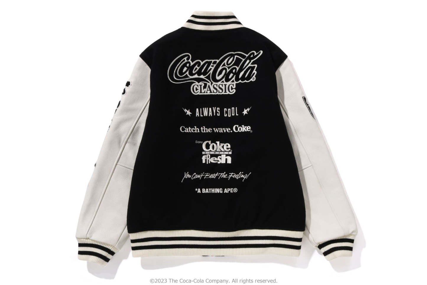 A varsity jacket with piece-dyed wool/nylon blend melton material on the body and cow leather on both arms. The lining is quilted with a COLOR CAMO pattern and padded. AthtPE HEAD Sagara patch with Coca-Cola on the left chest, Coca-Cola logo directly embroidered on the right chest, A BATHING AthtPE logo Sagara patch on the left arm, Coca-Cola Polar Bear embroidered emblem patch on the right arm, on the back A design with the Coca-Cola logo Sagara patch and multiple letter graphics directly embroidered. An X Coca-Cola woven name is stamped on the lower center of the body, and a piss name is tucked in the center of the hem. Slash pockets are placed on both sides. A silhouette with a relaxed fit. Available in 2 colors and 5 sizes. A collaboration model with Coca-Cola. ?2023 The Coca-Cola Company. All Rights Reserved.