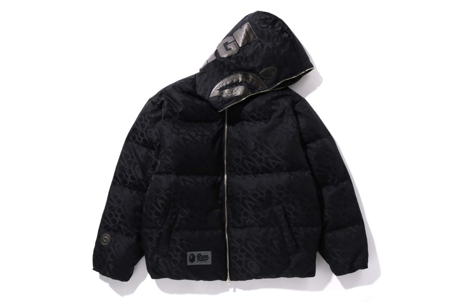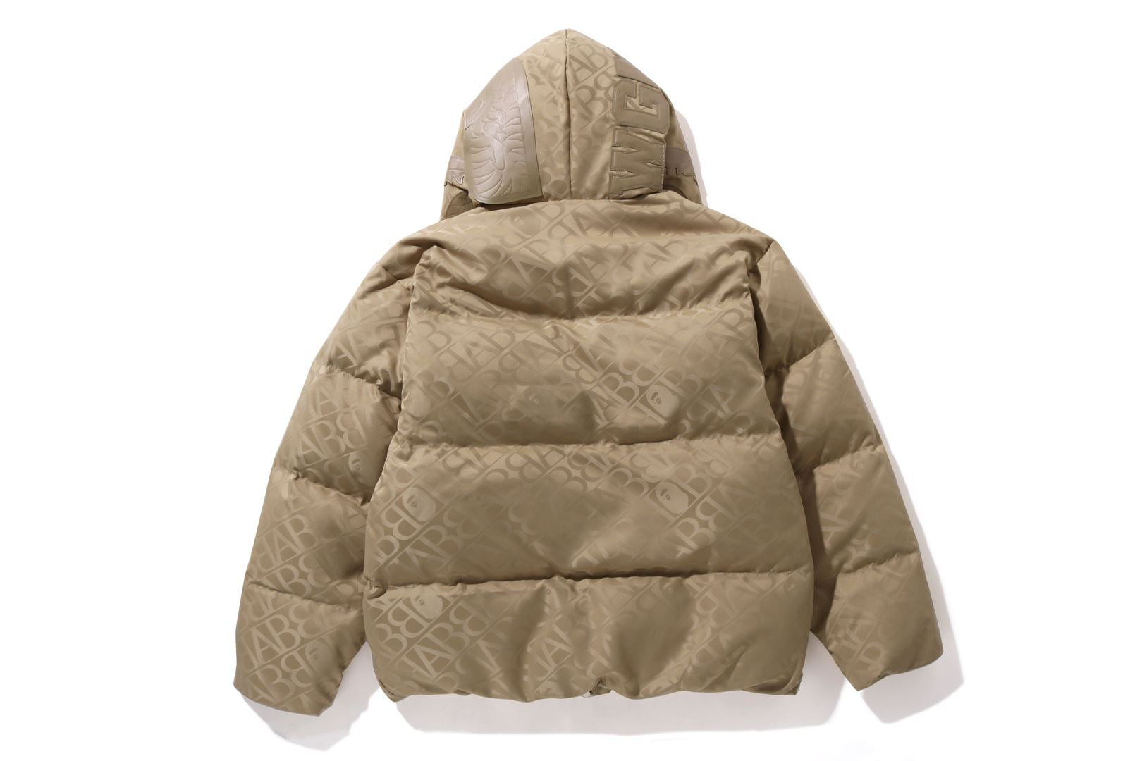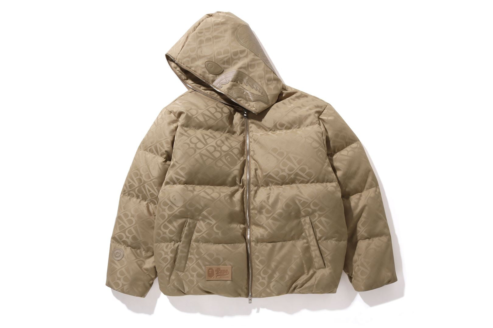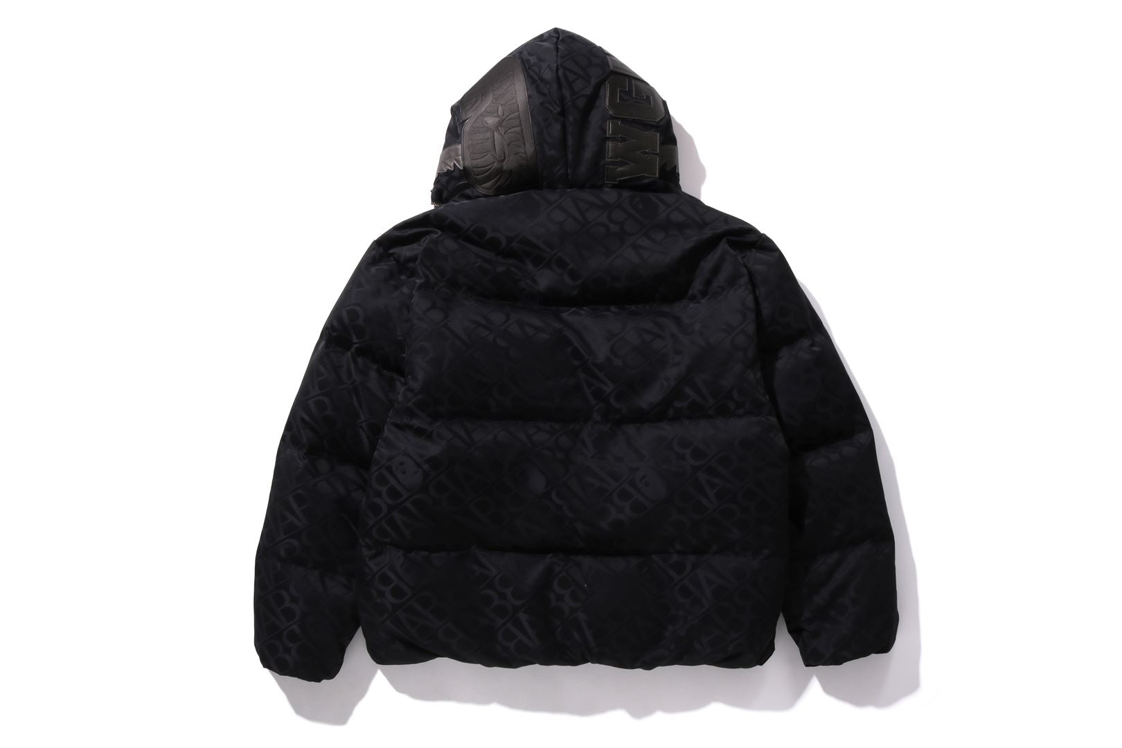 A puffer down jacket made of nylon material with an all-over monogram pattern. The padding uses KAWADA DOWN from Kawada Feather (90% down, 10% feather, 700FP) for high cold protection. The design features a shark felt patch on the front of the hood, a WGM Sagara patch on the right back of the hood, a TIGER motif rubber printed on the left, and a star circle motif directly embroidered on the right sleeve. The front zipper has a shark hoodie style design that opens and closes to the top of the hood. A rectangle name tag is affixed to the center hem of the body. Designed with slash pockets on both hips and spindles on both hems. A silhouette with a relaxed fit. Available in 4 colors and 5 sizes.