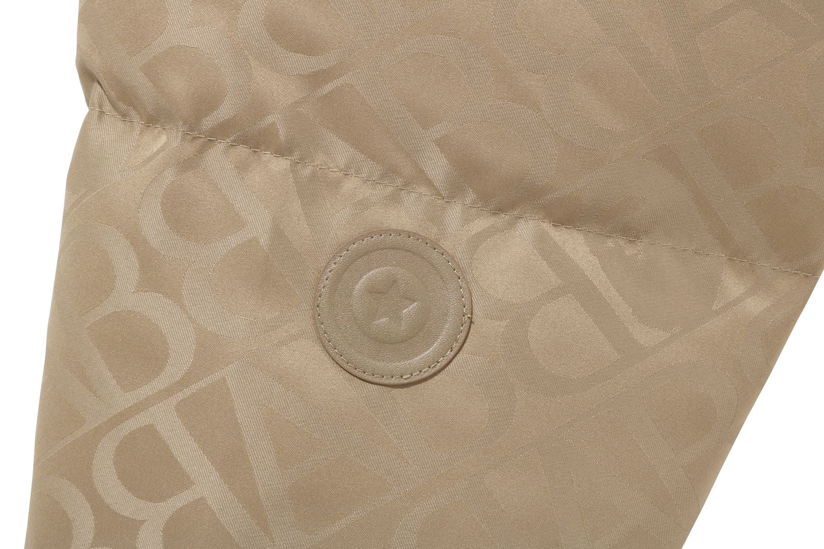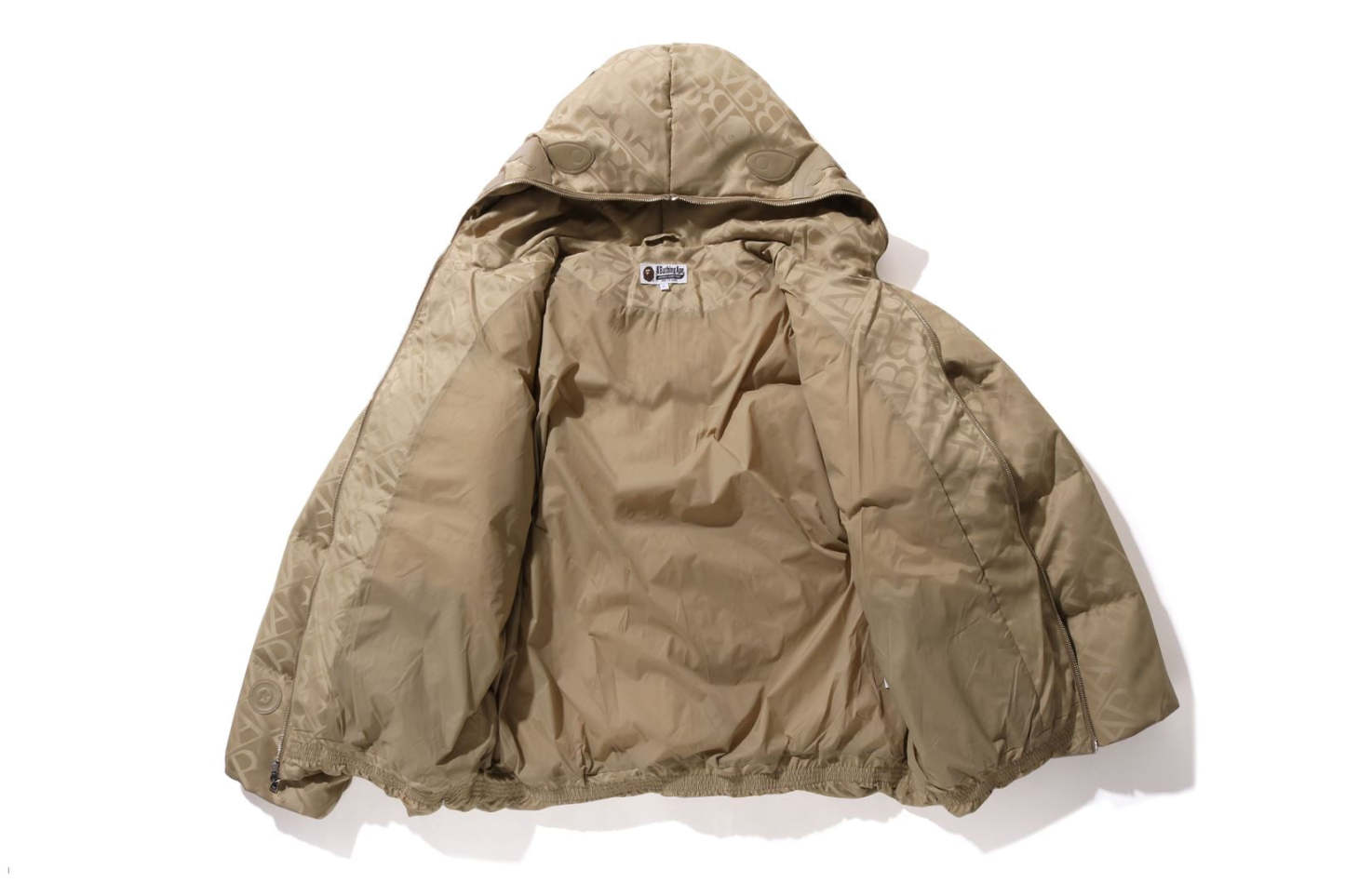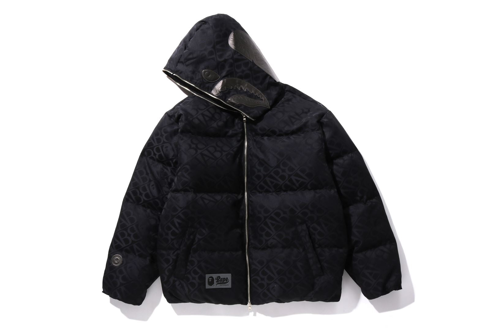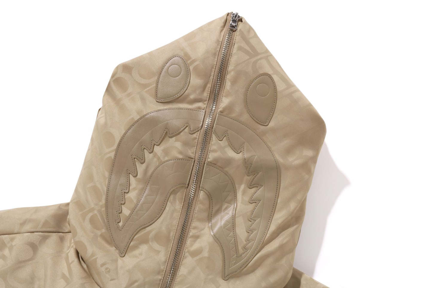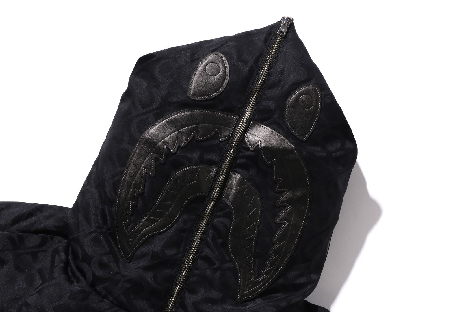A puffer down jacket made of nylon material with an all-over monogram pattern. The padding uses KAWADA DOWN from Kawada Feather (90% down, 10% feather, 700FP) for high cold protection. The design features a shark felt patch on the front of the hood, a WGM Sagara patch on the right back of the hood, a TIGER motif rubber printed on the left, and a star circle motif directly embroidered on the right sleeve. The front zipper has a shark hoodie style design that opens and closes to the top of the hood. A rectangle name tag is affixed to the center hem of the body. Designed with slash pockets on both hips and spindles on both hems. A silhouette with a relaxed fit. Available in 4 colors and 5 sizes.