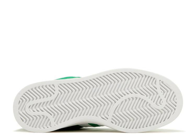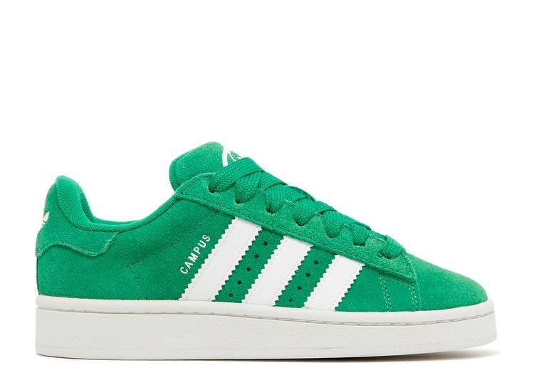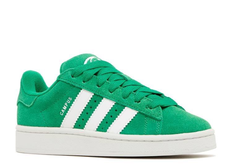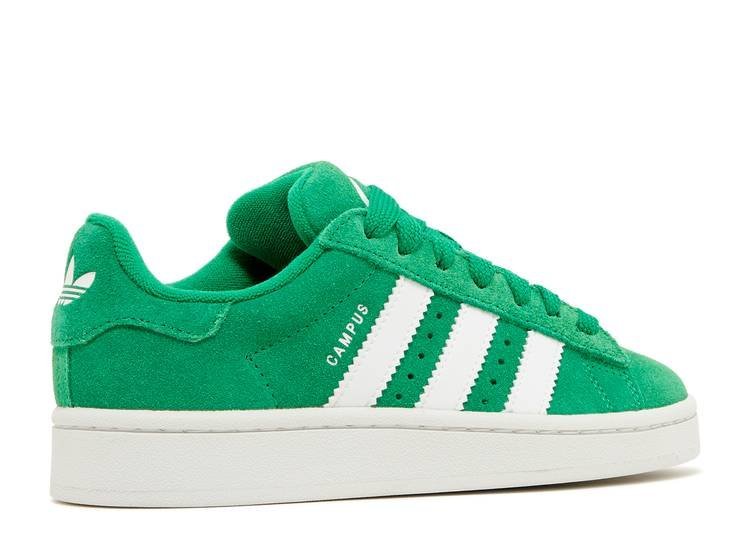 The Adithtdas Campus 00s Green Cloud White features a vibrant green leather upper, with the brand's signature three stripes in white leather on the side panel, perfectly matching the heel tab. This model, reminiscent of the Campus 80s , is finished with a pristine rubber sole to complete its look.