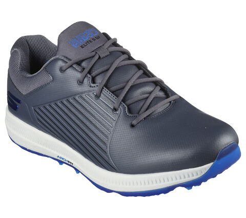 Handle the course in supportive comfort and smooth style with Skecththers GO GOLF® Elite 5 - GF. This waterproof lace-up golf design features a quarter embossed synthetic upper with a removable Arch Fit® insole and lightweight ULTRA FLIGHT® cushioning.