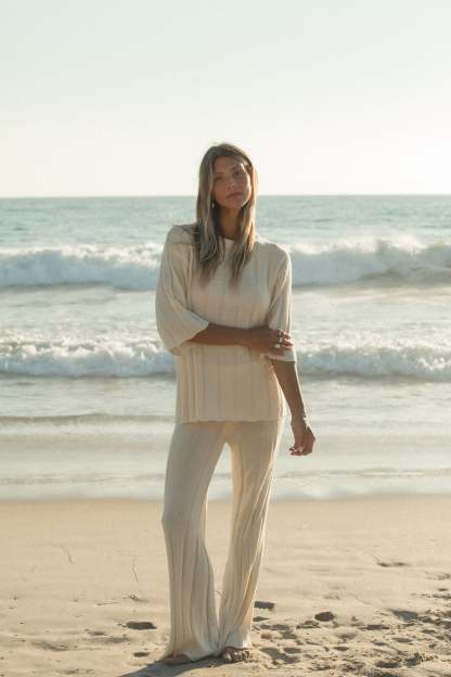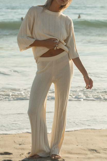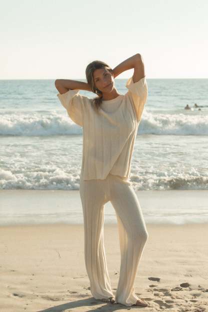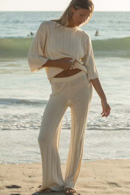 Stay cozy with our Seashell Ribbed Cotton Sweater Pants. Made with a soft, lightweight knit. Perfect for a casual day out or a lazy day at home.