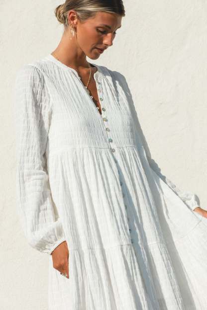 Introducing the Shores Button Maxi Dress, perfect for a coastal charm look. With its textured fabric and functional button-down design, this versatile dress effortlessly transitions from day to night. The included slip ensures a chic, comfortable look for any season.
