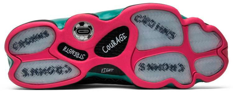 Part of the 2015 Doernbecher collection . this Air 13 Retro 閳ユェB閳?was designed by John Charles . an 11-year-old Crohn閳ユ獨 Disease patient. The design combines a black snakeskin-like upper with emerald green patent leather overlays and Volt laces. Details from John's personal life include his soccer number . the seven pills he takes per day to manage his condition and the 閳ユゥrohn閳ユ獨閳?on the outsole. Pink accents highlight the collar and outsole.