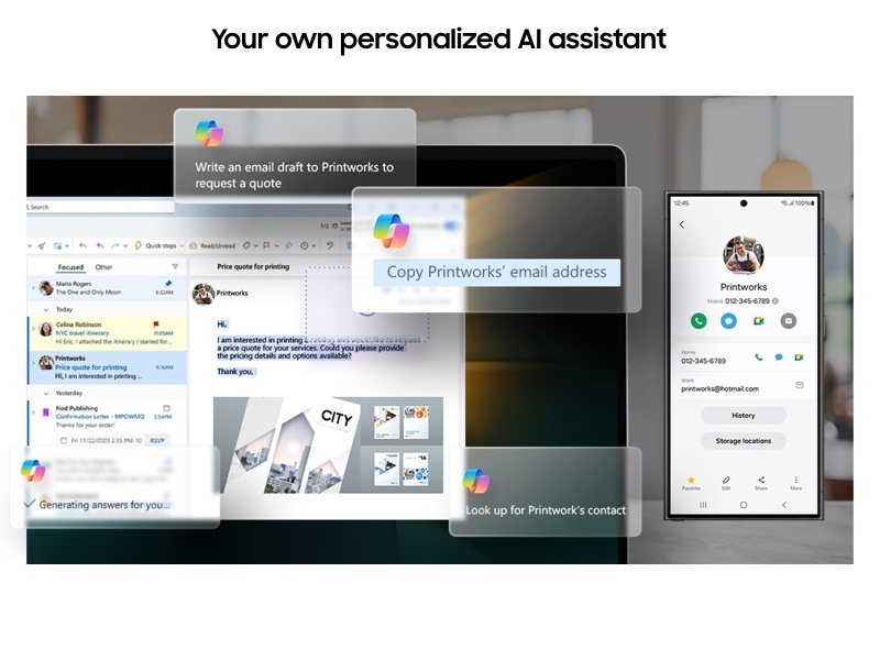 Manage your tasks via quick chat prompts with Copilot's personalized AI assistance.² Plus, get smarter communication tools—access contacts and send messages effortlessly with a simple chat command.