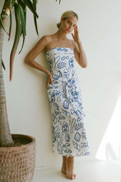 This Amalfi Coast Linen Printed Strapless Dress features a stunning blue print inspired by a soirée on the Amalfi Coast. The strapless design and waist-hugging tie detail provide a flattering and stylish silhouette.