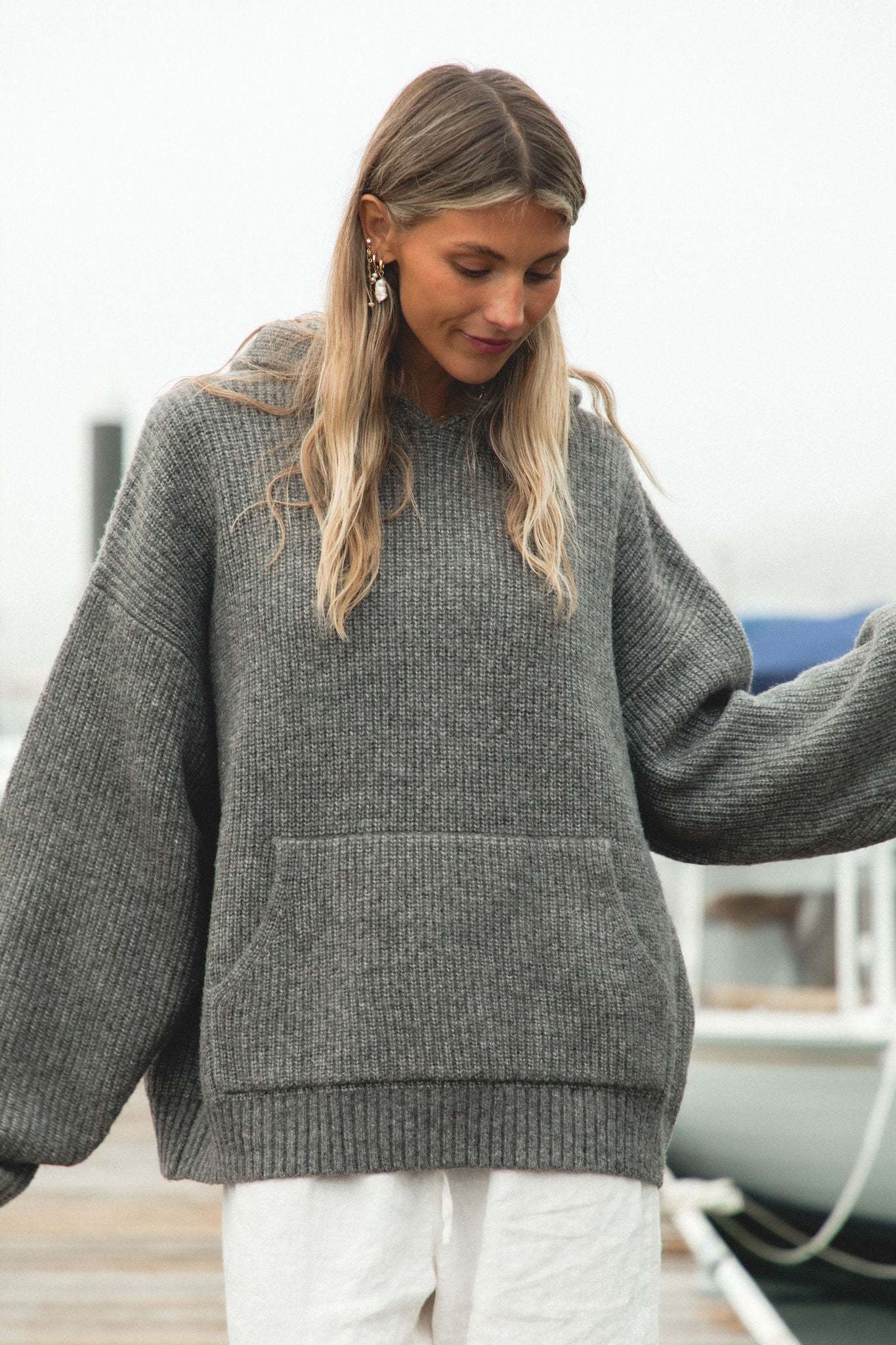 Stay cozy and stylish in our Malibu Mist Wool Blend Hoodie. With its oversized fit and classic hoodie design, this hoodie is perfect for lounging or layering. The soft and thick non itch fabric will keep you warm and comfortable.