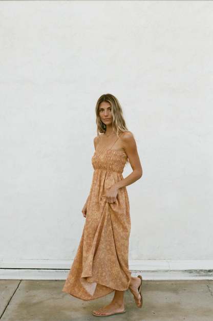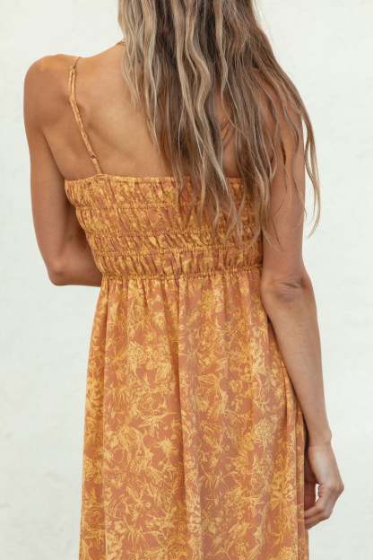 Meet the Sunrise Smocked Spaghetti Dress, which offers a beautiful print detail and a stretchy smocked chest fit. This midi length dress provides both style and comfort - a perfect addition to any wardrobe.
