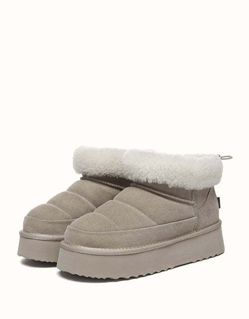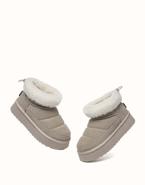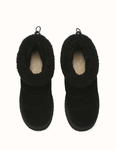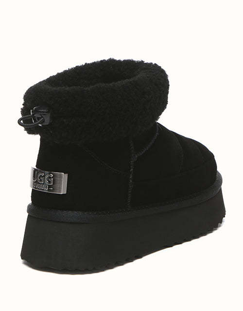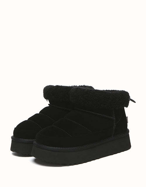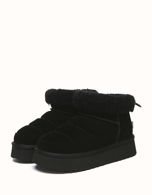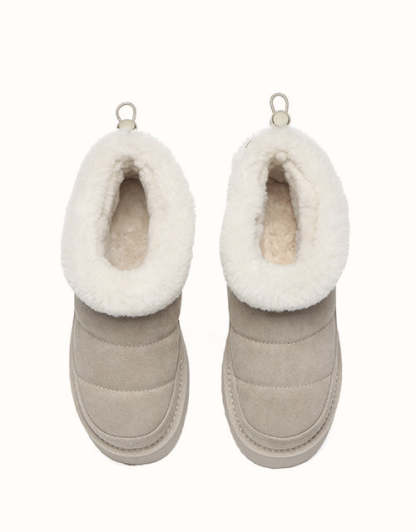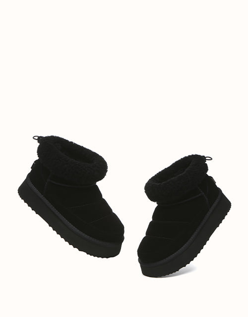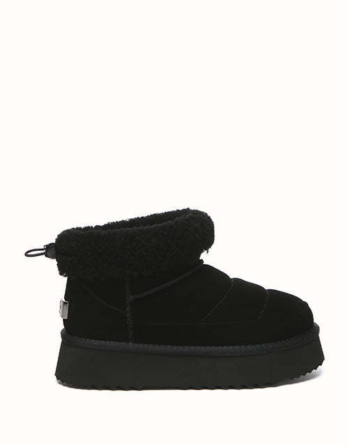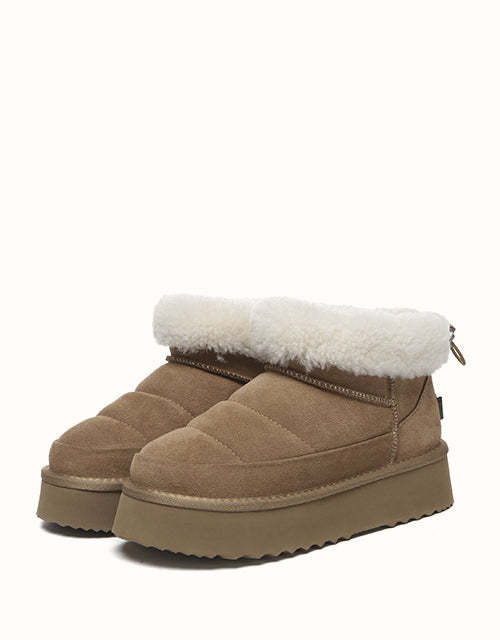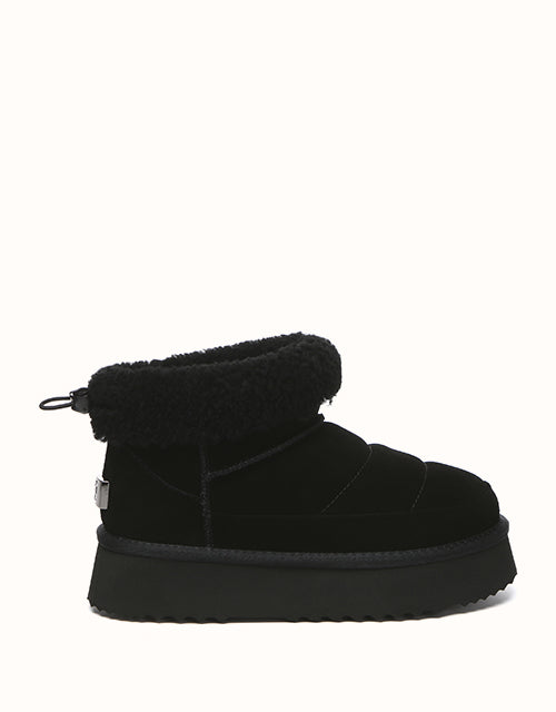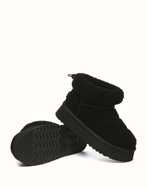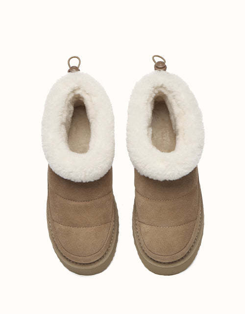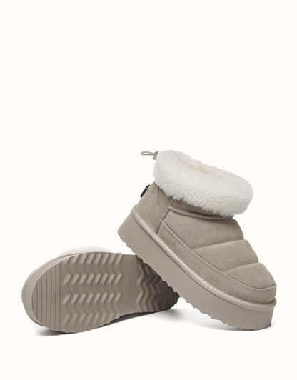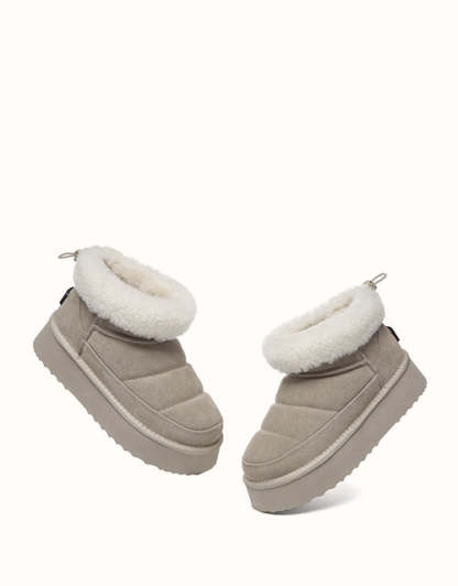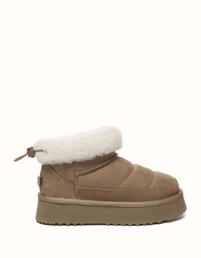 Sortez avec style avec les bottines EVEthtRAU Payton, alliant design audacieux et confort douillet. Confectionnées en daim de vachette de qualité supérieure avec une finition imperméable, elles sont ornées d'une bordure en laine douce pour une touche féminine. Doublées de laine de mouton thermorégulatrice, ces bottines gardent vos pieds au chaud toute la journée. Leur plateforme épaisse ajoute de la légèreté sans sacrifier le confort. Disponible en marron, noir et sable, un incontournable chic pour l'hiver pour chaque garde-robe.